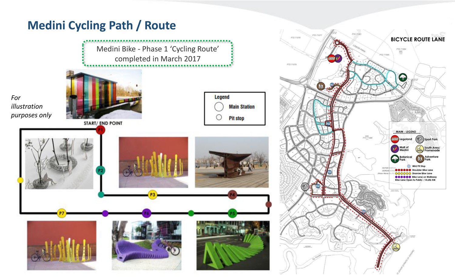 Medini’s brand new cycling path stretches from north to south of Medini, spanning 22 kilometres in length that provides residents a viable alternative to vehicular transportation. There is a total of five strategically located pit stops along the path for cyclists to park their bikes and enjoy the sights. The cycling path is designed to allows cyclists to enjoy the urban township’s green spaces and public art attractions.